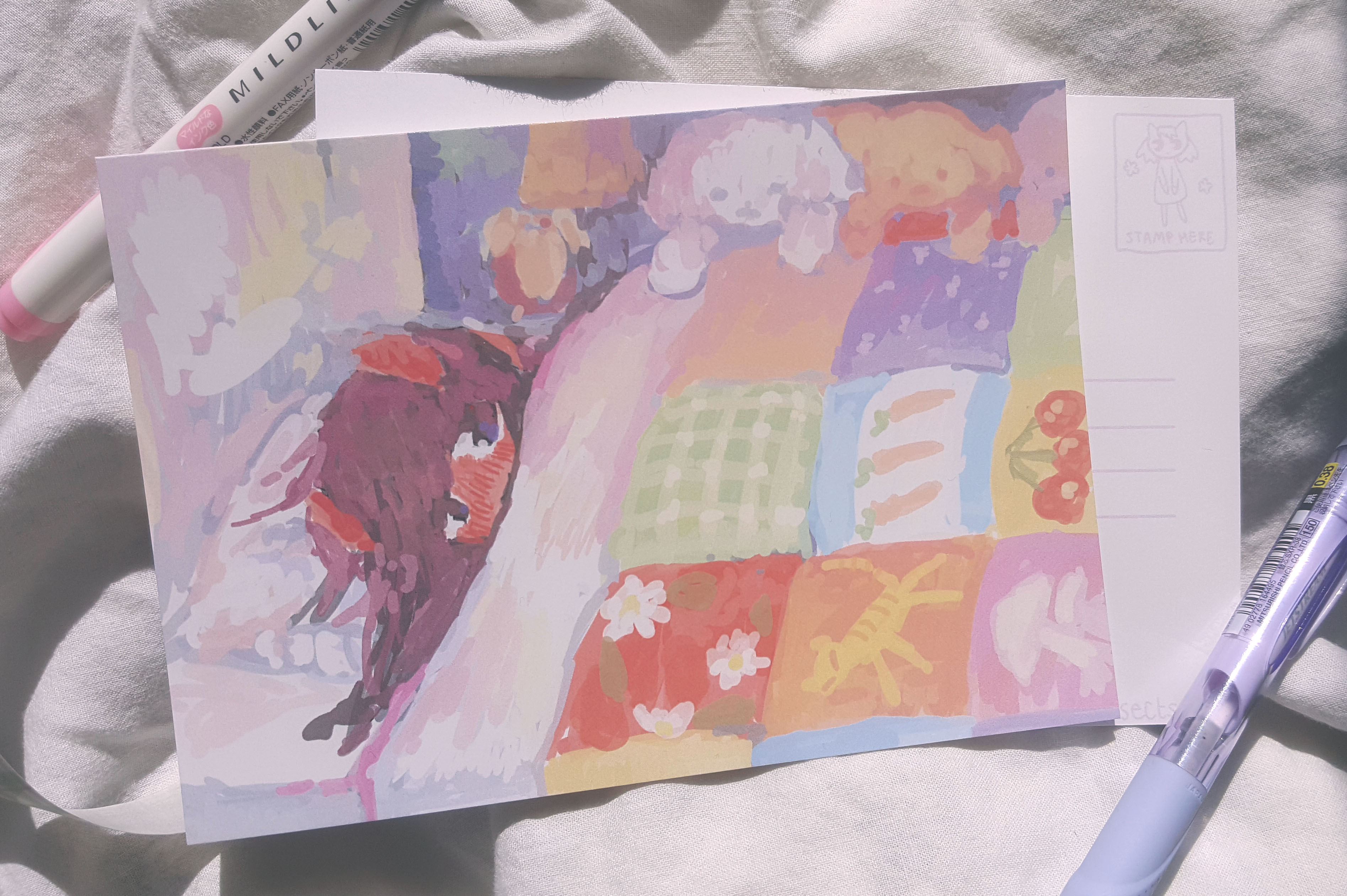 This is a A6-sized postcard with my character Kiwi on it. It has lines on the back to help you write an address if you want to send it to someone, as well as a marked spot to put the stamp.